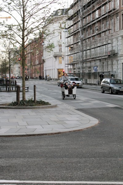 In Kopenhagen daarentegen zijn de fietspaden breed en is de doorstroming goed. Schrijfster van het NRC-artikel nam de proef op de som: ‘op een eersteklas huurfiets rijd ik een fraaie fietsroute langs de haven, over kades en speciaal aangelegde fietsbruggen, inclusief de onlangs geopende Cykelslangen, een oranjekleurige, slangvormige brug die over het water kronkelt. Elegant, niet te steil, en exclusief voor fietsers. Het is allemaal tiptop in orde. Maar deze Harbour Circle is een toeristische fietsroute; hoe zit dat als je je in de spits waagt langs Kopenhagens hoofdroutes? Het Deense leven is, meer dan het Nederlandse, homogeen georganiseerd. Ouders zijn doorgaans tweeverdienend en werktijden zijn vrijwel overal hetzelfde. En dus brengt iedereen ’s ochtends vroeg, rond 8.00 uur, de kinderen naar crèche en school; een uur later zijn de straten verlaten. Werkdagen zijn relatief kort, rond 15.30 uur wordt de omgekeerde weg afgelegd. Als ik om 16.00 uur over de Dronning Louises Bro richting het westen fiets, ben ik ingesloten door bakfietsen vol kinderen. Toch biedt de Norrebrøgade, waar vierdubbele, geasfalteerde fietsbanen zijn aangelegd, voldoende ruimte om elkaar te passeren.’